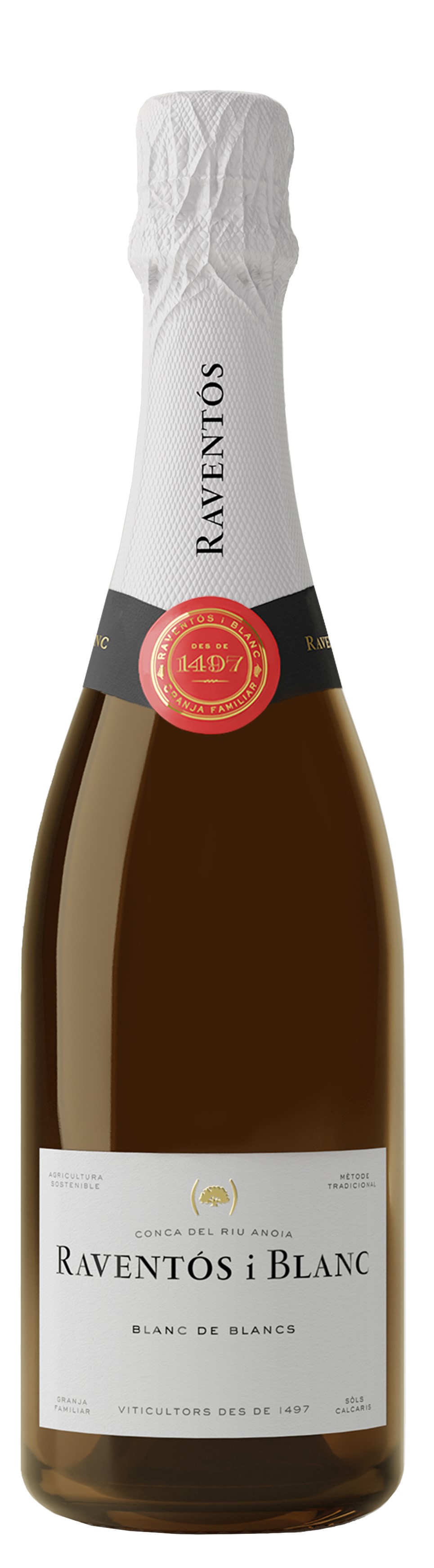 Raventós i Blanc has 50 hectares of vines in the Conca del Riu Anoia, Alt Penedès. They are farmed using Biodynamic principles, with manure from the farm's animals as the base for the compost. The climate here is Mediterranean with mild winters and warm, dry summers. The estate is surrounded by three mountain ranges: Sierra Litoral in the east, which acts as a rain shadow from the wetter coastal areas, Montserrat in the north and Sierra d'en Compte in the west, both providing wind breaks and cooling temperatures from the Pyrenees. The vineyards are divided into 44 plots, according to their soils and microclimates. The fruit for the Blanc des Blanc is sourced mainly from the ‘La Plana’ vineyard. These are the estate’s youngest vines, grown on clay-loam soils with a high percentage of fossils. This gently sloping vineyard sits at 120-170 metres above sea level.