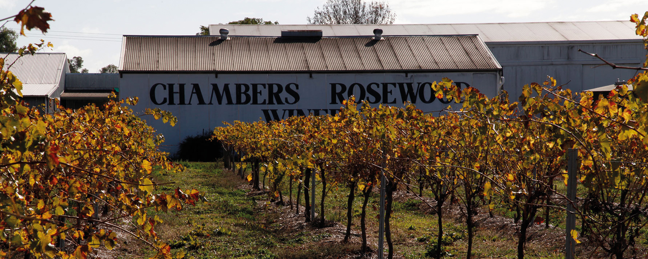 Chambers Rosewood makes distinctive yet classical wines from their 50 hectares of vineyards. The Rutherglen Muscats are made from the darker-skinned Muscat à Petits Grains Rouge variety (a mutation of Muscat à Petits Grains Blanc) and winemaking has been subtly changed in recent years to make fresher, cleaner wines. Each vineyard plot is fermented separately in closed, stainless steel tanks to preserve the grapes’ perfumes. Fermentation is stopped when the must reaches between 14.5 and 15.5 Baumé (potential alcohol), by adding neutral grape spirit as is traditional in fortified wine production. Upon settling, the wine is racked and placed into old oak casks (from 10 to 100-years-old, and 225 litres up to 5,000 litres in size) until required for blending. The average age of the Rutherglen Muscat blend is four years, and this has increased in recent years as new vineyards have come into production. In exceptional vintages, grapes from Chambers Rosewood’s low-yielding centenarian vines are used for the ‘Old Vine Muscat’, made using a separate, special solera.